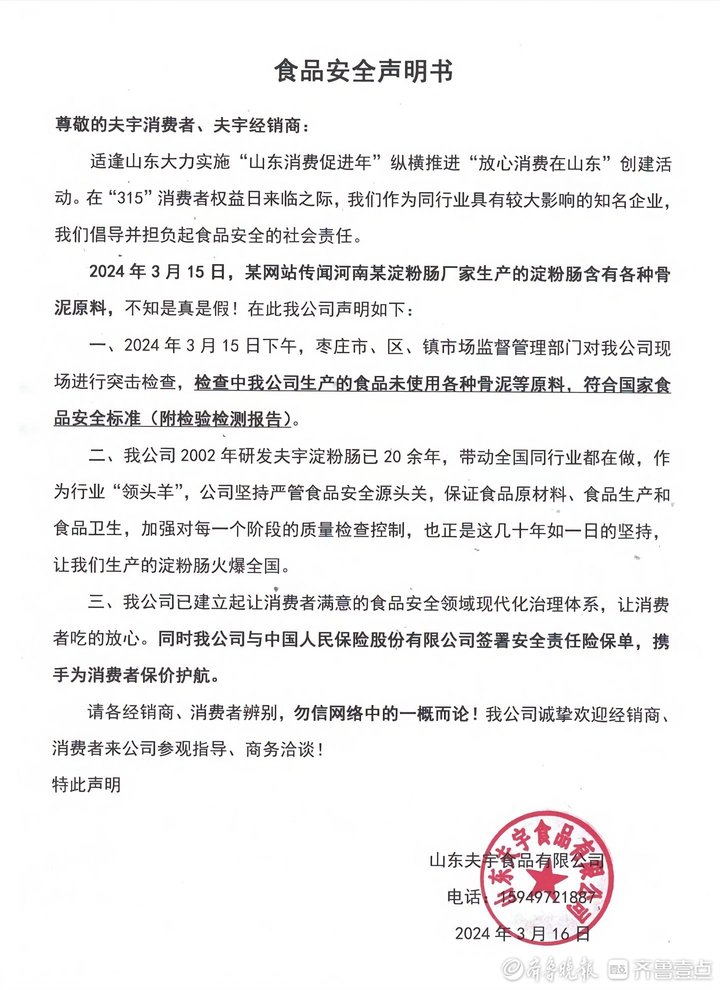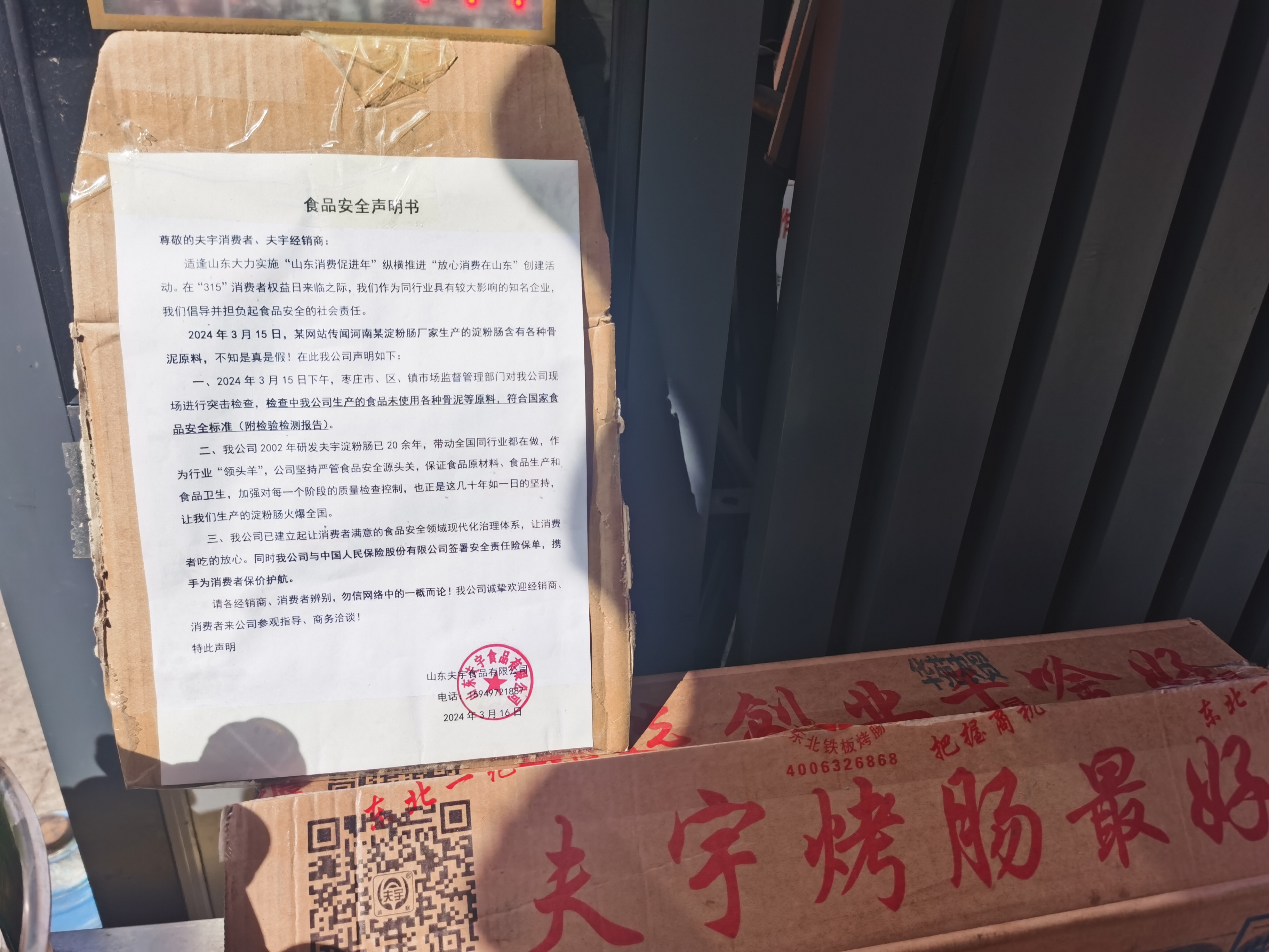 “受影响太大了,卖不出去!”摊主指着旁边的一箱淀粉肠有些愁眉苦脸,“本来这一箱昨天就能买完,结果现在还剩不少”。临沂华丰商业街内,一个淀粉肠摊位上还有各种食材的卷煎饼。半个多小时,阿姨的卷煎饼生意没有断过,但淀粉肠只卖出了一根。“我进的淀粉肠都是好的,夫宇的品牌货。”摊主一边说着,一边拿出了贴在纸板上的食品安全声明书。
