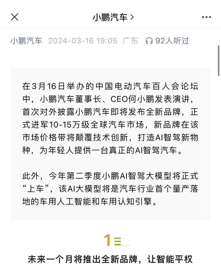 3月16日,何小鹏在中国电动汽车百人会论坛上发表了演讲。宣布小鹏汽车将发布全新品牌,进军10-15万级的汽车市场。何小鹏对这个新品牌期待颇高,表示会为这个市场区间带来颠覆性的技术创新,为年轻人提供真正的AI智驾汽车。