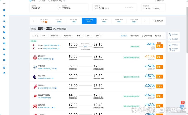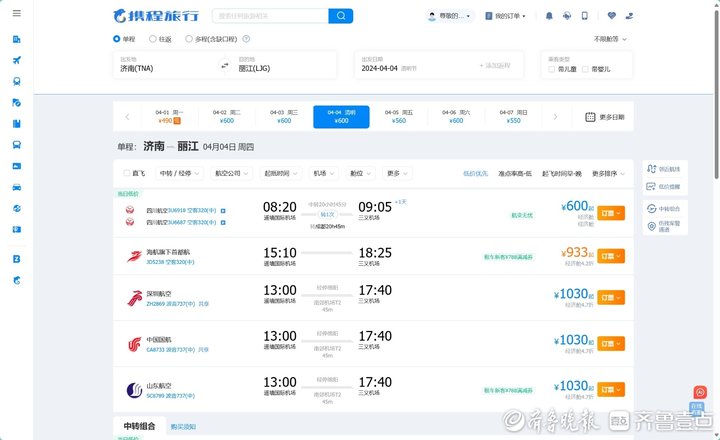 以上述丽江、三亚为目的地,3月20日14时54分,记者在携程旅行平台查询到,4月4日清明节当天济南直飞丽江航线经济舱价格最低933元起,转机航班最低600元起;直飞三亚航线经济舱价格最低1100元起,转机航班最低610元起。相较于春节假期,机票价格有较明显回落。