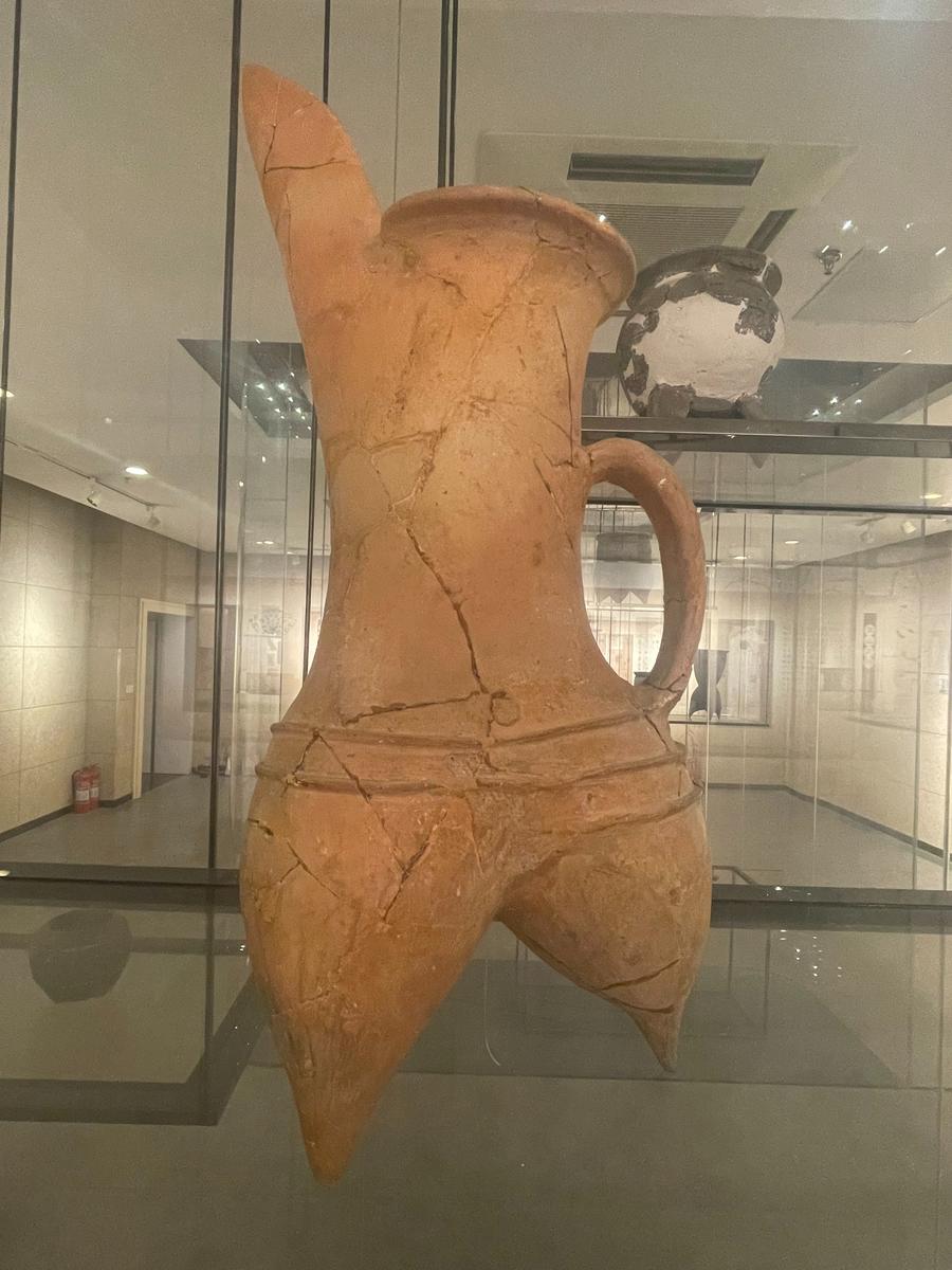 另外一件伸着长而尖的“鸟嘴”的陶器,叫做陶鬶,相当于现在的烧水壶。它是龙山文化时期先民烧水用的。看其构造,三个空心的袋状足盛水较多,且受热面积较大。上面高高的流口形似鸟喙,整体看去像一只展翅欲飞的玄鸟,体现了当时东夷族对鸟的图腾崇拜。任冰说,“这件器物既美观又实用,而且还有图腾崇拜的意义,所以说它是龙山文化时期非常典型的一件器物。”