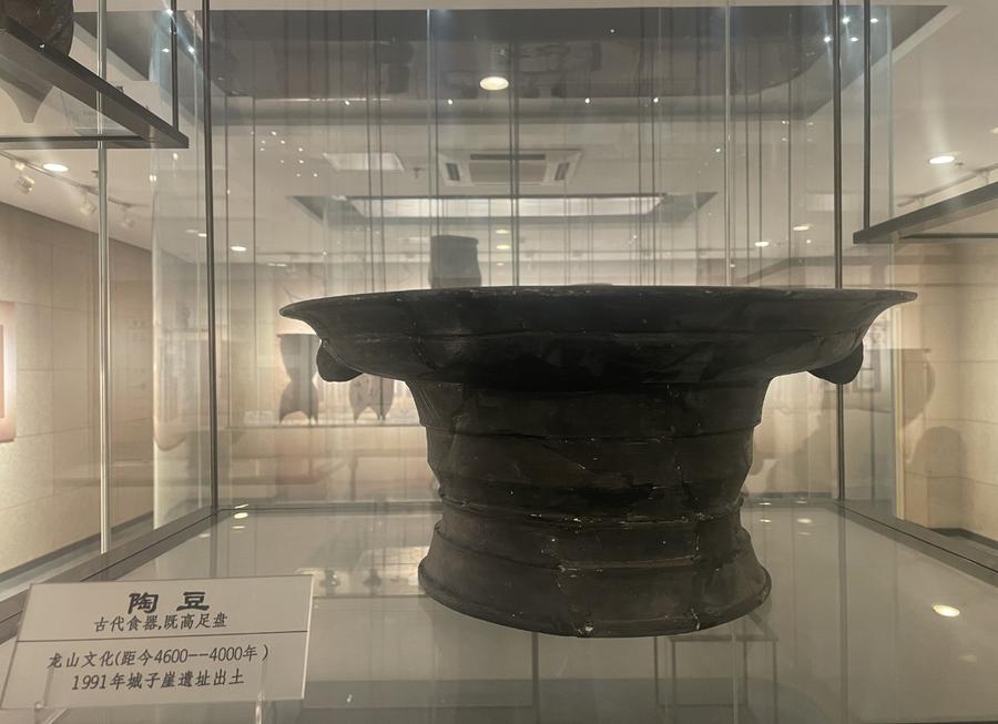 城子崖遗址博物馆里,还陈列着遗址出土的体型最大的一件陶豆。中国古人崇尚以大为尊,说明当时使用这件器物的主人身份之尊贵。任冰介绍,如此大型的陶豆,主要用于祭祀的场合,把猪头、牛头等放置陶豆上,来祭祀神灵。当然,把自己最重要的器物摆在上天面前,也体现了对上天的尊敬崇拜。陶豆的器型可从“豆”字在古时的象形字看出,上面一横为豆盘,下面两竖代表豆柄,最下面一横为豆足,古时的“豆”字与今意并不相同,单指这件器物。今人吃的豆,在古代则为“菽”。