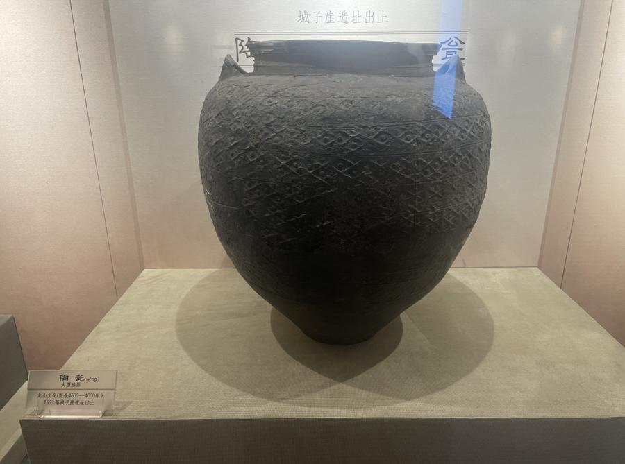 与小巧的香薰炉形成强烈反差的,是一件令人叹为观止的“巨型”陶瓮。任冰介绍,这是用来储存粮食用的陶瓮。陶瓮体型较大,说明使用者身份的尊贵。而储存粮食较多,又说明了使用者较为富足。另外,陶器上面排列着菱形圆点纹,这是发现的龙山黑陶里为数不多的带纹饰的一件陶器,因此也是极为珍贵、重要的一件文物。