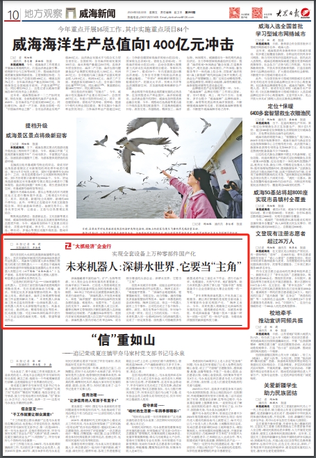 3月22日,大众日报以《实现全套设备上万种零部件国产化——未来机器人:深耕水世界,它要当“主角”》为题,重点报道了山东未来机器人有限公司不断拓展机器人在深海领域的应用场景,深海机器人国内市场占有率达60%,成为细分赛道的头部企业,名副其实的未来水世界“主角”。