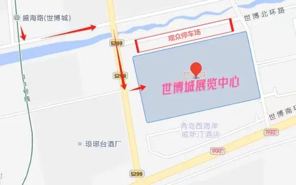 地铁线路:地铁13号线至盛海路(世博城)站-B出口,按照红色箭头指引步行到达