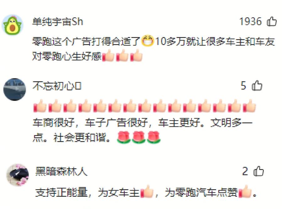 该事件在网络传播后,引起了不少网友评论。一些不了解零跑品牌和车型的网友开始探讨零跑车辆的性能、售价等,也有“眼睛雪亮”的网友表示,“零跑的这个广告打得合适了,10多万就让很多车主和车友对零跑心生好感”“这免费奖励汽车的广告效应绝对比在电视台黄金时段投放二十秒广告效果还要好”。