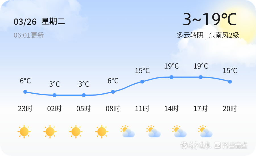 今天是3月26日,星期二,农历二月十七。多云转阴,东南风2级。