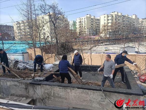 登州路社区对寿光路5号恒基小区楼顶及广饶路支路垃圾杂物乱堆乱放进行集中清理