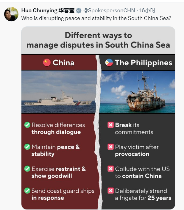 随后,华春莹发表图文,清晰列举并对比中菲两国处理南海争端的不同方式。中方通常秉持以下原则:通过对话解决分歧,维护和平与稳定,保持克制并表现出善意,派遣海警船回应。菲方以往的做法则是:违背承诺,挑衅后扮演受害者,勾结美国遏制中国,蓄意让一艘军舰“坐滩”25年。“谁在破坏南海的和平与稳定?”华春莹反问。