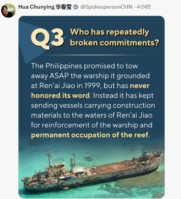 “谁对仁爱礁拥有主权?”“谁是麻烦制造者?”“谁在背后煽风点火?”针对菲律宾擅闯中国仁爱礁邻近海域,并试图借此议题煽动国际舆论,中国外交部部长助理、发言人华春莹连续两日在社交媒体X平台上发表多条图文质问回击。