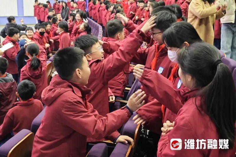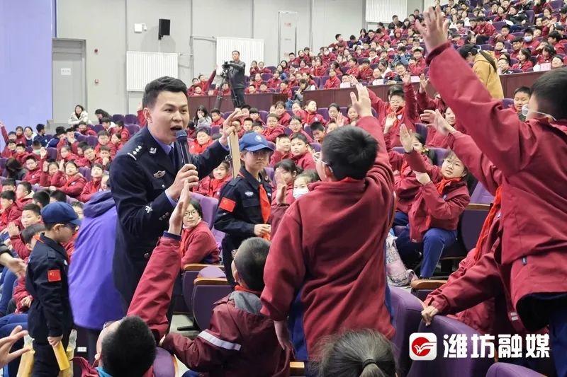 当天下午4时45分,在“拒绝校园欺凌 保护少年的你!”全国中小学生安全教育日主题活动现场,潍坊未来实验学校百余名中小学生端坐台下,舞台屏幕上“向校园欺凌勇敢说不!”的口号感染着在座的每一个人。活动开始之前,潍坊市公安局未成年人犯罪预防宣防教官王晟舜先组织现场学生进行了一场相互握手拥抱的互动游戏,通过友善的肢体接触,让学生感受同学间的友好氛围。