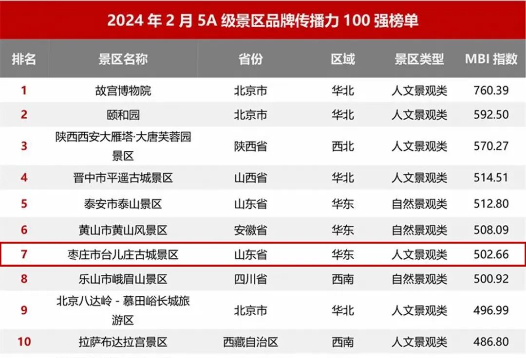 3月22日,迈点研究院独家发布“2024年2月5A级景区品牌传播力(MBI)100强榜单”,台儿庄古城景区跻身榜单前十,位列全国第七,MBI指数为502.66。