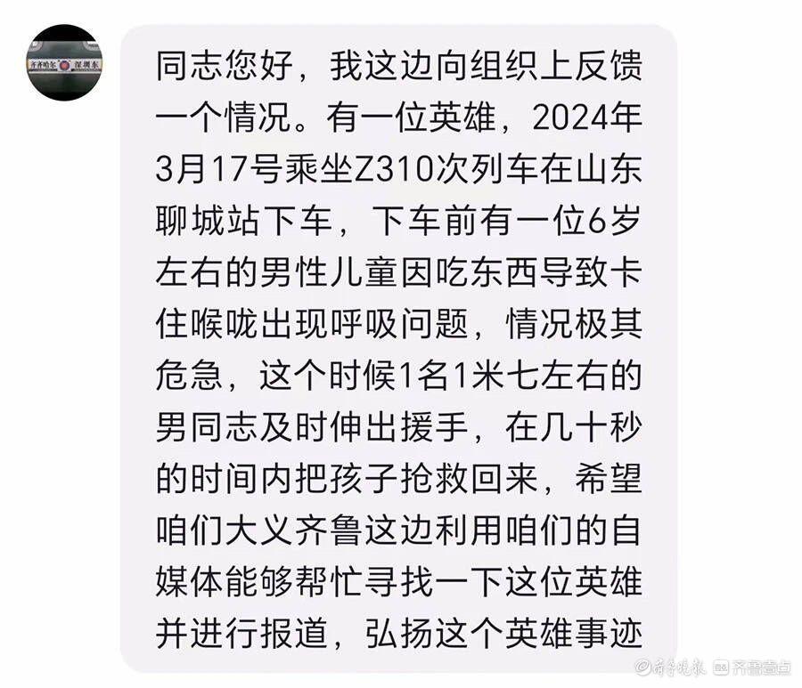 据了解,3月17日13:30左右,在由深圳东发往齐齐哈尔的Z310次列车上,12号卧铺车厢一名6岁左右男童在进食时被异物卡住喉咙,造成呼吸困难,情况十分危急。就在此时,一名身高一米七左右、身穿黑色夹克的男子挺身而出,及时对男童采取急救措施,在几十秒钟内让孩子转危为安,众人不由得纷纷为他竖起大拇指。随后,该男子在列车抵达聊城站时下车。