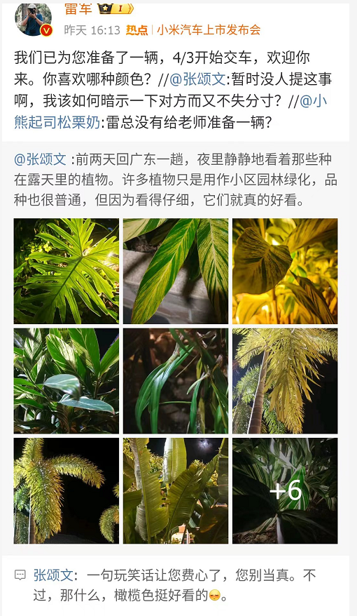 突然到了30号这天,雷军亲自出面回复张颂文,“我们已为您准备了一辆,欢迎你来,你喜欢哪种颜色”。可能是雷军担心3月28日正式上市发布会热度不够,提前做的准备。后来发现,全网都在报道小米汽车,热度足够了,就往后移了一下。