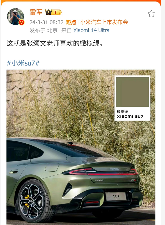 后续的工作也就水到渠成了:31日,雷军公布张颂文喜欢的橄榄绿车。