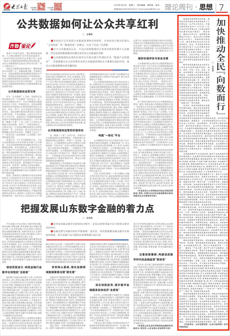 近年来,我省加快提高全民数字素养和技能,制定出台相关配套政策措施,积极开展数字经济主题宣传周、全民数字素养与技能提升月、数字强省宣传月等活动,推动全民数字素养与技能提升行动向纵深发展,助力数字强省建设提速。数据显示,山东网民数量达到7700多万,约占总人口的76%,居全国前列,有力带动了数字经济发展,数字经济总量达4.3万亿元,占GDP比重超过47%,产业数字化指数领跑全国,国家级工业互联网平台数量全国第一。我省提升全民数字素养取得了良好成效,有力夯实了数字经济发展的基础。但我省数字经济依然存在很大的发展空间,数字经济竞争优势有待塑强,数字经济创新能力有待提高。进一步推动我省数字经济高质量发展,需要大量数字经济高水平复合型人才的支持,需要提升全民数字素养与技能。在全面提升全民数字素养进程中,要立足发展实际,充分调动各方积极性和多元力量形成合力、取得实效,助力数字经济高质量发展。