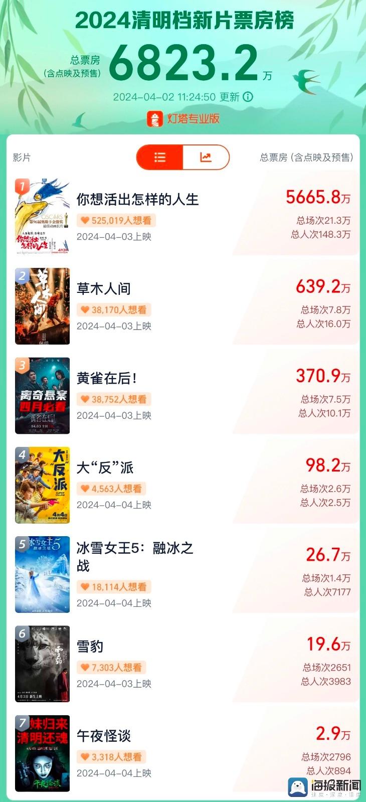 今年清明档,宫崎骏新片《你想活出怎样的人生》持续保持最高热度,从目前的预售票房来看,其以5665.8万元的成绩稳列第一,是第二名《草木人间》预售票房的近九倍,可谓是遥遥领先。
