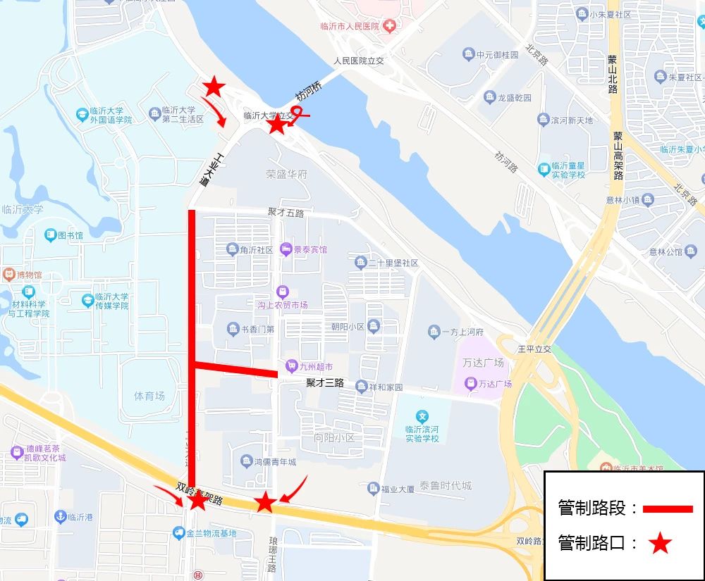 据公告显示,本次临时交通管制路段有工业大道路段(双岭路至聚才五路)、聚才三路路段(琅琊王路至工业大道)、双岭高架由西向东工业大道匝道下出口、双岭高架由东向西琅琊王路匝道下出口、武汉路祊河大桥由西向南右转匝道口、武汉路祊河大桥由东向南左转匝道口。交通管制区域和时间段内,除执行任务的警车、消防车、救护车、工程抢险车及安保、电力、通讯等保障车辆及有通行证的车辆外,其他车辆禁止通行。