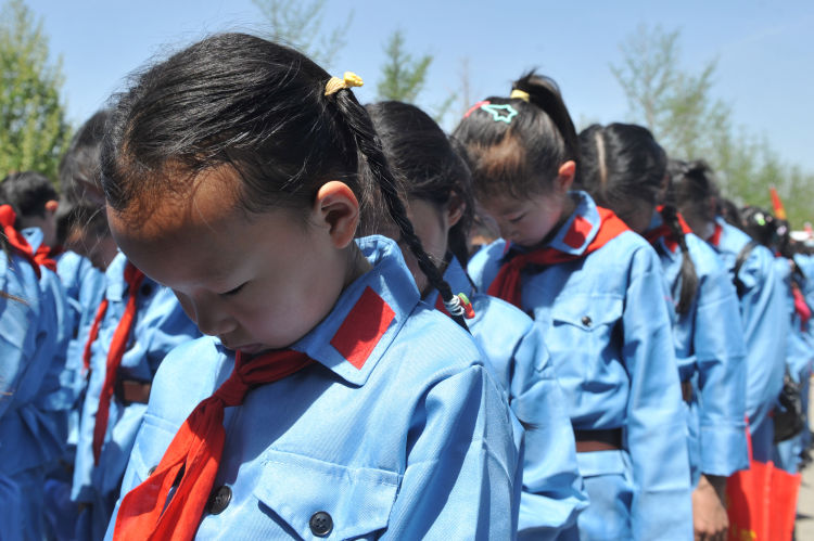 黑铁山脚下,庄严肃穆,小记者们向牺牲的革命烈士默哀。