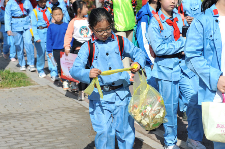 一名小队员正在把垃圾放到小姐姐随身带的垃圾袋里。小姐姐把垃圾袋绑在书包上,一路上垃圾不落地。