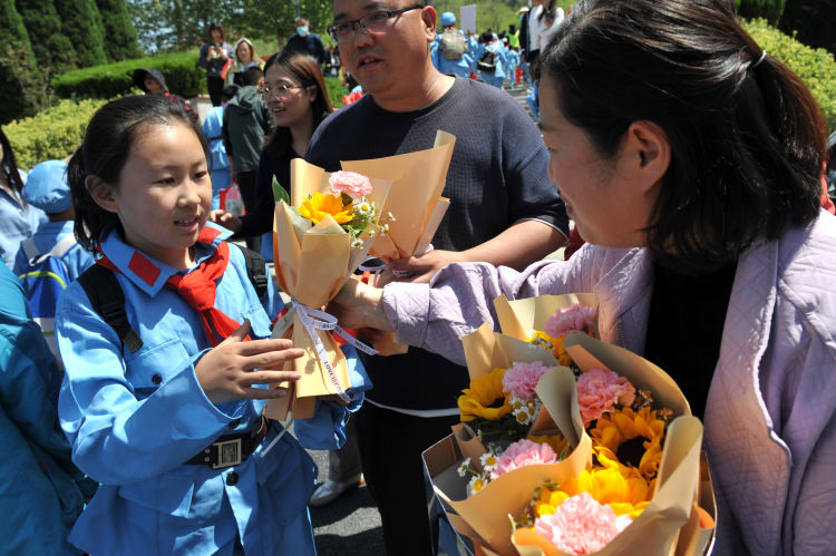 有心的家长在终点用鲜花迎接胜利的“小战士”。