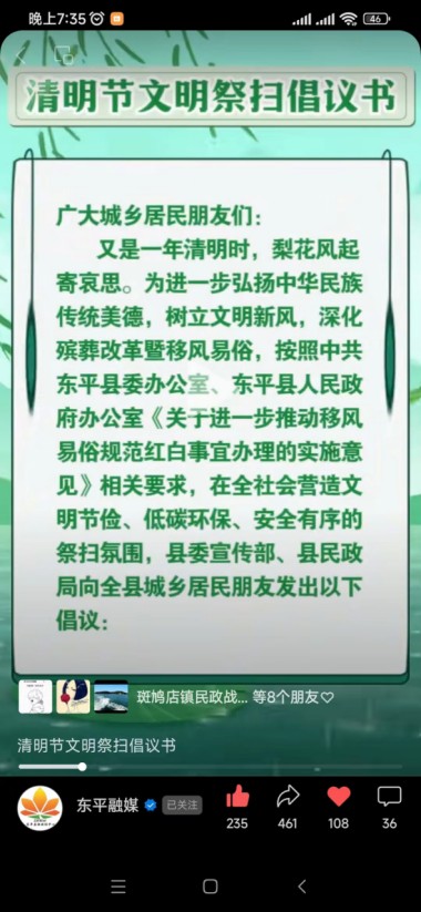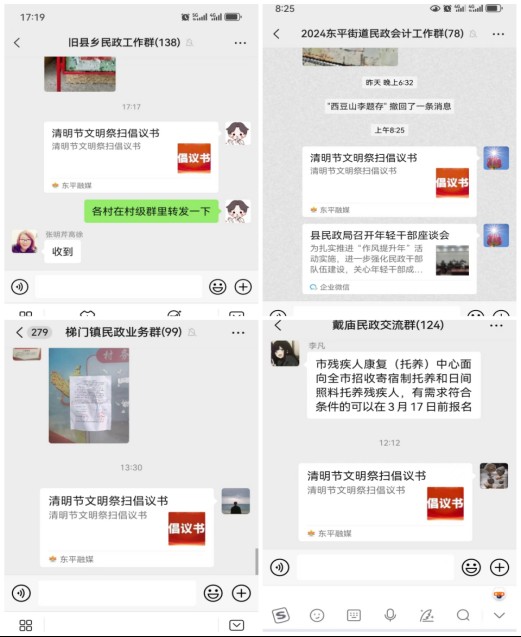 加大宣传,营造氛围。制作《清明节文明祭扫倡议书》,通过微信工作群、东平融媒视频公众号进行转发,提升社会对文明祭扫和安全祭扫的知晓率。在县殡仪服务中心通过悬挂条幅、发放明白纸、制作提示牌等方式,向前来祭扫的群众宣传移风易俗和殡葬改革政策。指导各乡镇(街道)开展清明文明祭扫宣传,大力倡导绿色祭扫和厚养简葬、孝亲敬老的文明新风。