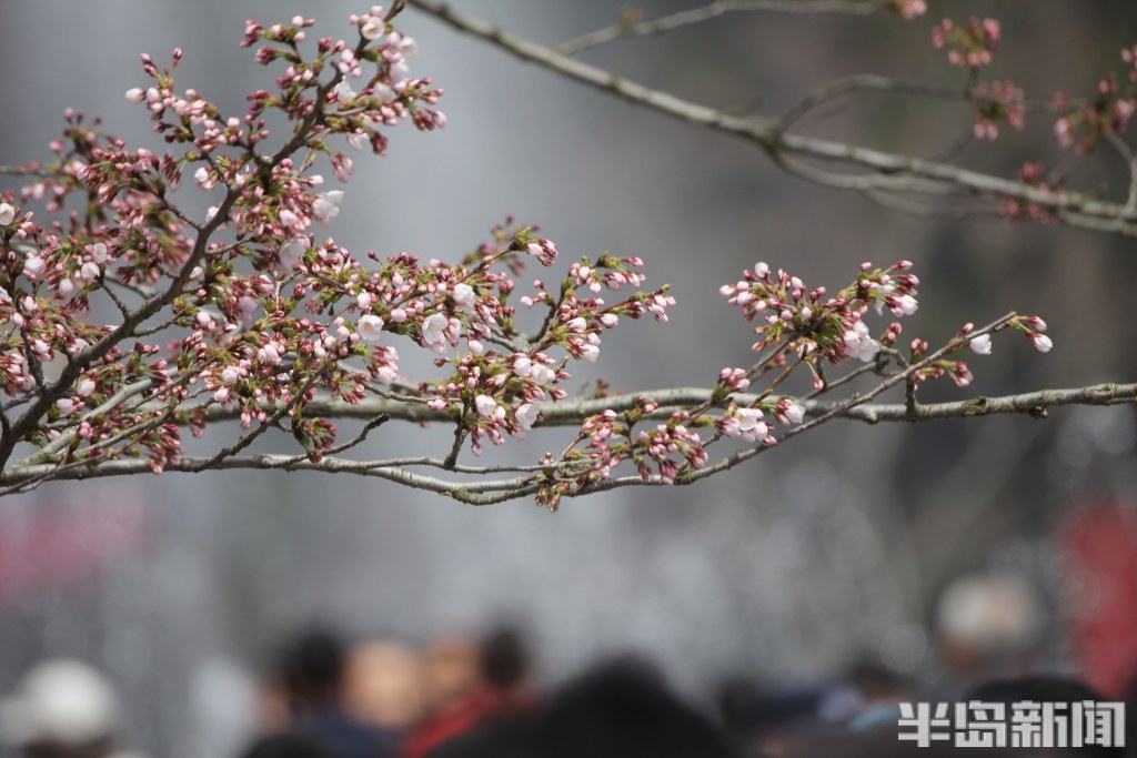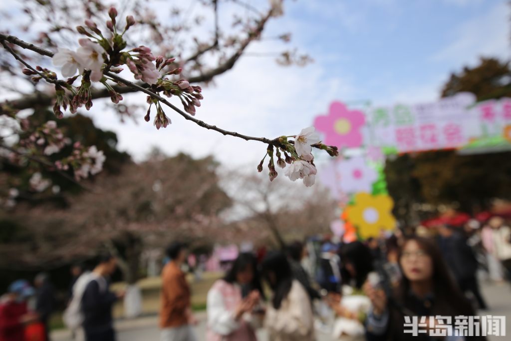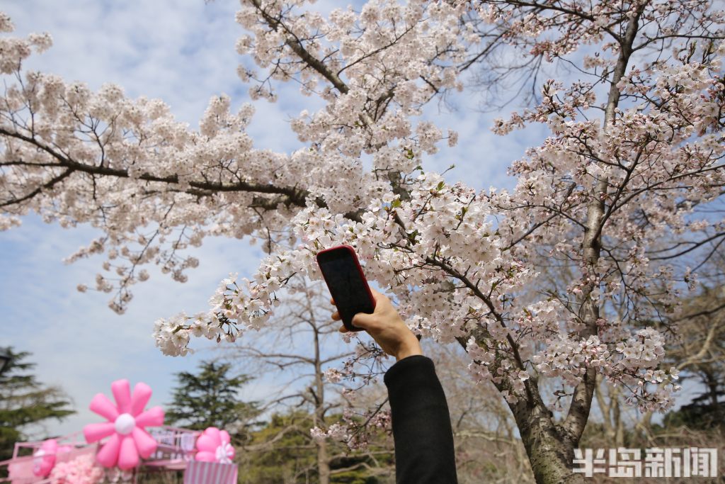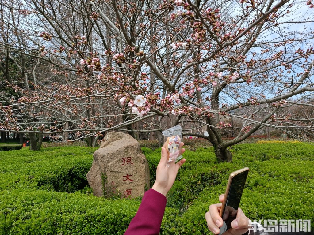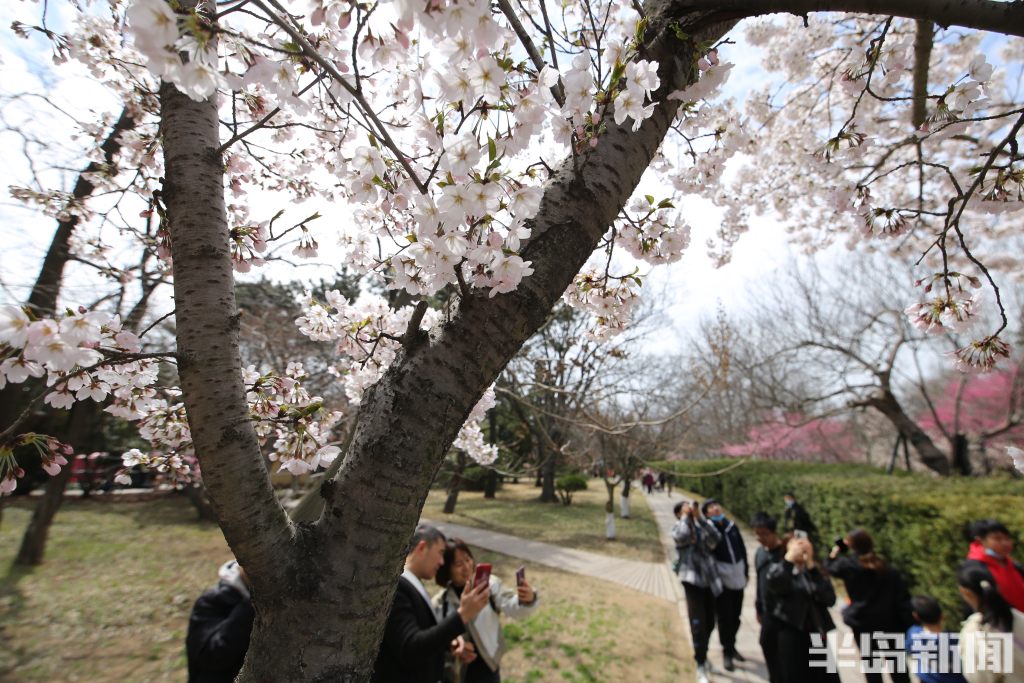 4月4日,青岛中山公园樱花初绽报春。当日是清明假日第一天,市民游客纷纷来到中山公园踏青游园。部分向阳的樱花率先绽放迎客,有一棵因为光照充足全部怒放进入盛花期,吸引很多人排队打卡拍照,成为网红樱花树。