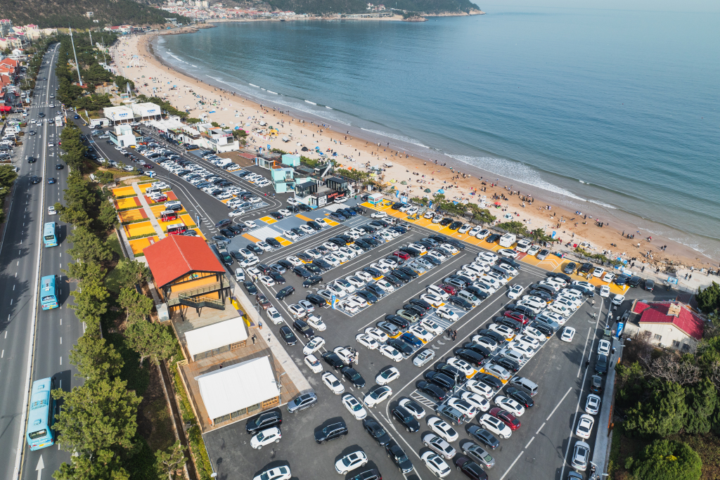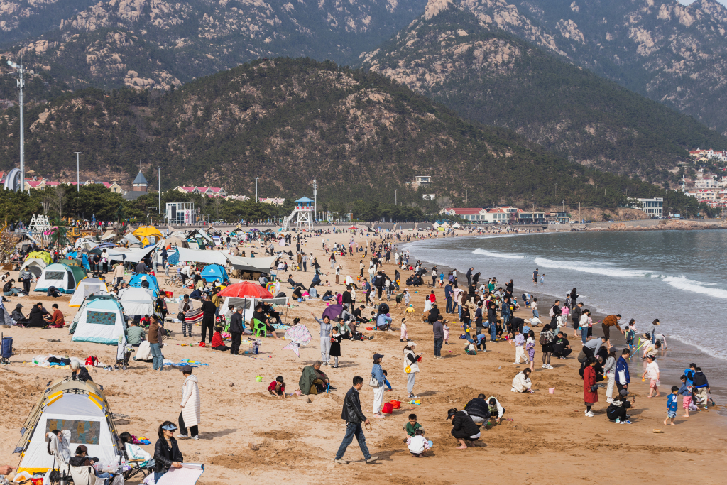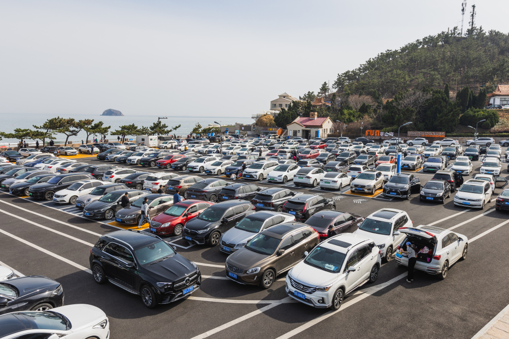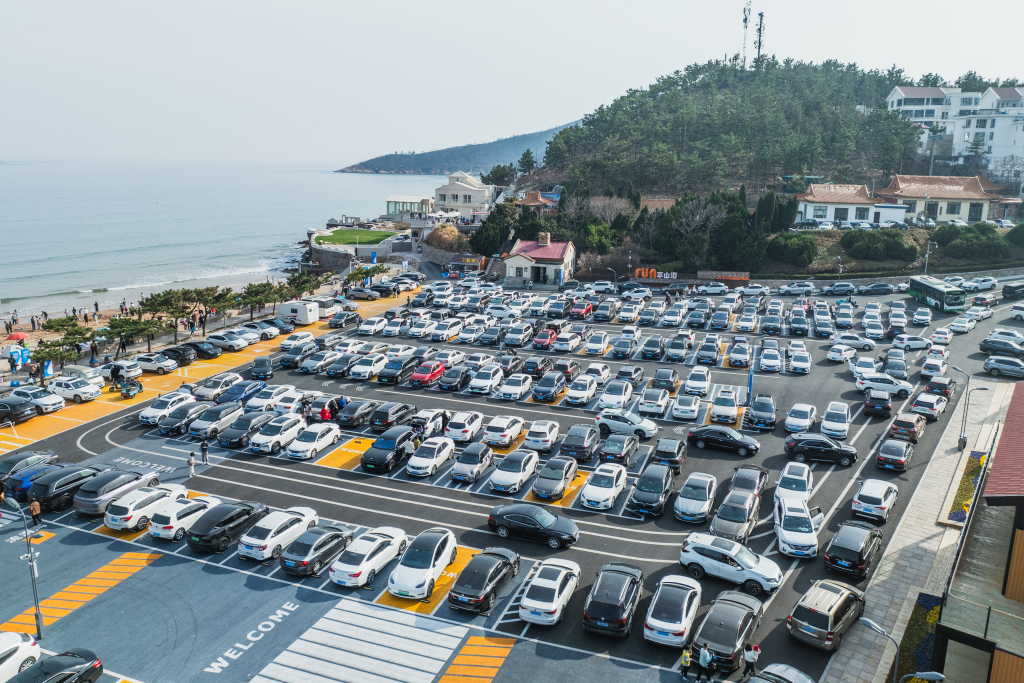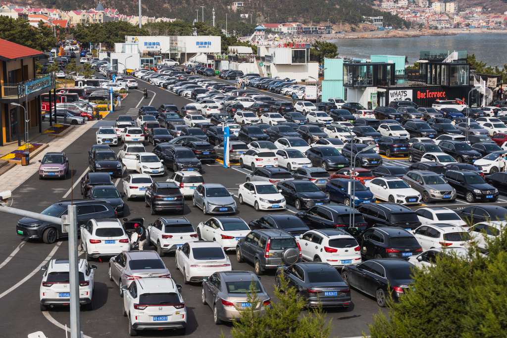 4月4日,清明小长假第一天,位于青岛崂山区沙子口街道的流清湾公园迎来大批游客,停车场一度处于满员状态,无论是进入海滩还是驶离海滩都需要排队等待。