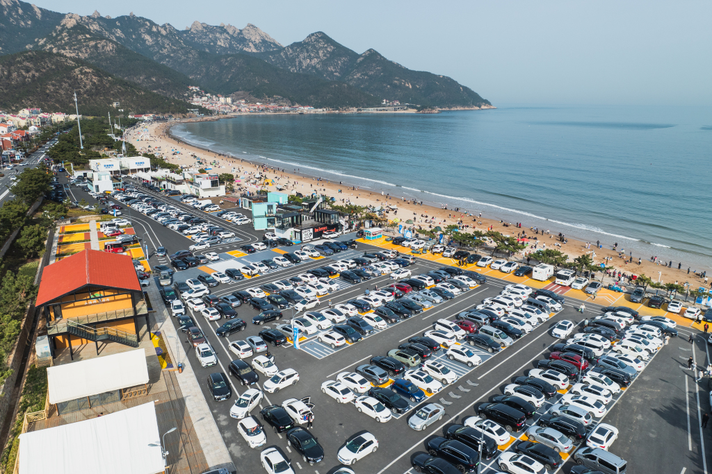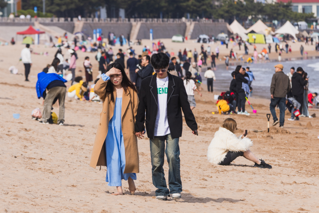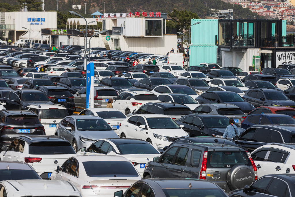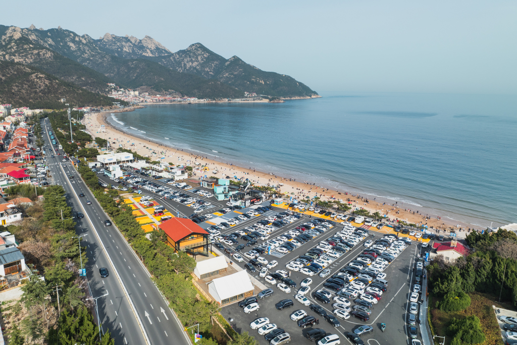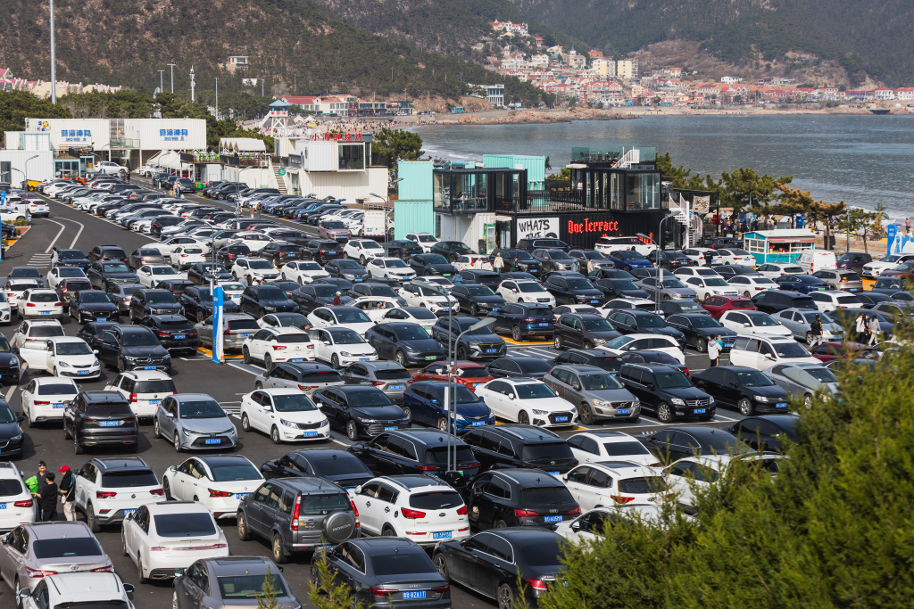4月4日,清明小长假第一天,位于青岛崂山区沙子口街道的流清湾公园迎来大批游客,停车场一度处于满员状态,无论是进入海滩还是驶离海滩都需要排队等待。