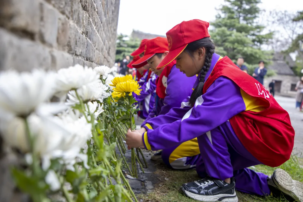 在山东枣庄台儿庄古城,当地学生参加鲜花祭奠活动。(受访单位供图)在山东枣庄台儿庄古城,梅花、樱花、梨花竞相绽放。古城街头,投壶、锤丸、蹴鞠等传统民俗活动令人应接不暇。在台儿庄古城无名英烈遗址处及大战遗址公园内,游客们向革命先烈敬献鲜花、默哀致敬。