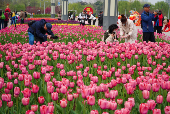 4월 2일 지난취안청 광장에서 시민 관광객들이 활짝 핀 튤립을 감상하고 있다. 최근 지난의 공원 광장에 튤립이 만개하여 많은 시민과 관광객이 봄을 즐기러 왔다. (서속회 신화사 통신 기자 보도)