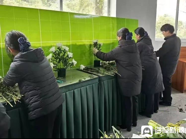彭有为(右一)和实习同事布置灵堂 受访者供图