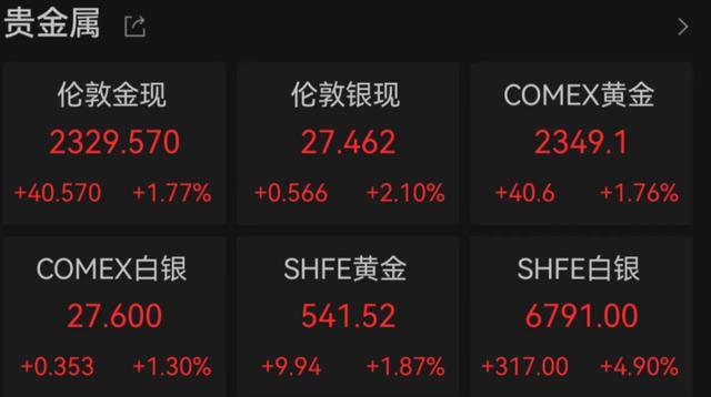 周五晚上金价继续大涨,突破历史新高!Wind数据显示,COMEX黄金大涨1.76%,报2349.1美元/盎司;伦敦现货黄金大涨1.77%,报2329.57美元/盎司。