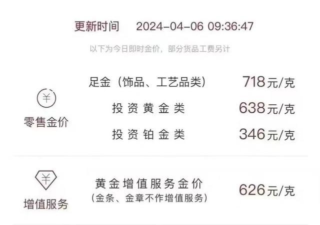 同样在4月6日,周生生、老庙黄金、周大福、老凤祥、潮宏基的足金饰品零售挂牌价格也分别已经飙升到719元/克、717元/克、718元/克、717元/克、718/克。同日上海黄金交易所现货黄金AU9999最新价为537.5元/克。