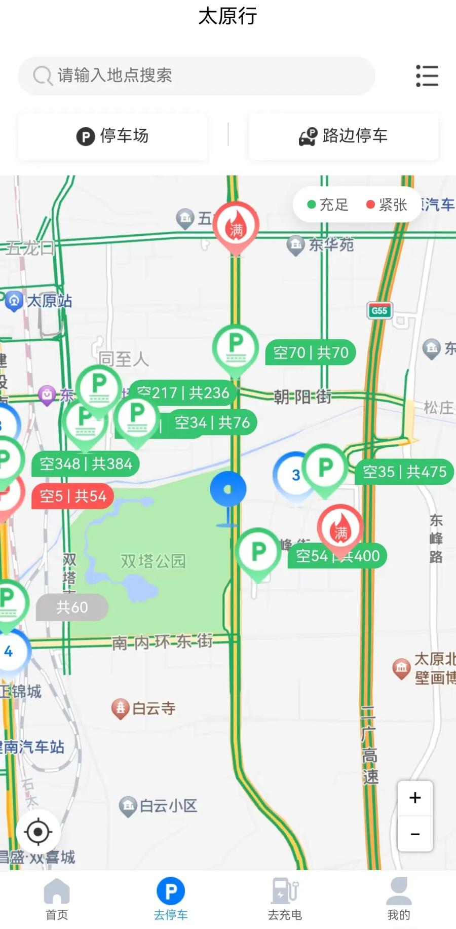 不久前,王馨雅开车带家人到太原市一家饭店吃饭。她提前打开了“太原行”App,点击“去停车”按钮,输入目的地搜索后,地图页面上显示出目的地附近的停车位,绿色图标代表车位大量空余,红色图标则代表车位紧张。