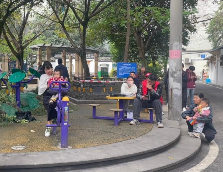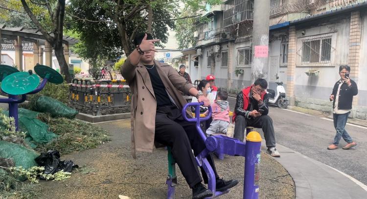 通往网红设施的路不到20米,正好能容纳一辆快递小三轮和一位行人同时经过。时有背着包的新鲜面孔来访,拿出手机在入口处拍照打卡后径直走向健骑机,与买菜回来的成都嬢嬢(niángniáng)擦肩而过,前者激动、后者平静。