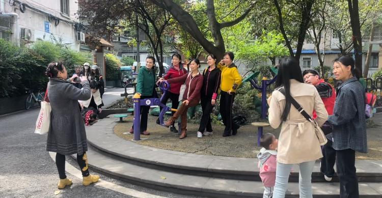 一位身穿绿衣的成都嬢嬢先是好奇地观望着排队的人群,看到年轻人打卡后,她效仿着骑了健骑机,下来后又自然地转了一旁的转轮。接着,她拉来四位身着彩色上衣的嬢嬢,一同拍照、打卡。