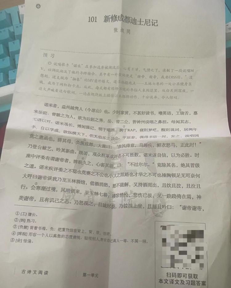 园园(化名)拿出了一份用文言文书写的《新修成都迪士尼记》,自称自己是成都本地人,就住在附近,既是成都大学中文系学生,也是这份文书的创作者,这篇仿古文记录了诺米的人生经历和这周发生的事,是在前一天写作完成,并根据高考考纲出了解读的题。