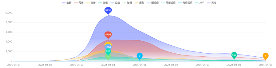 齐鲁蛙眼舆情大数据平台显示,自4月1日至4月9日17时,相关话题全网信息量约为2.38万条。全网声量最高峰出现在2024年04月04日,共产生9436条舆情信息。