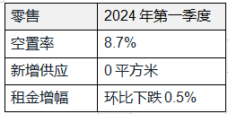 统计数据显示,一季度无新项目交付,市场供需关系稳定。截至2024年一季度,全市优质零售地产市场存量为588万平方米,其中非核心商圈的项目占31%,已成为存量物业中比重最大的部分,表明近两年下沉商业市场的快速发展。整体市场空置率保持不变,仅环比下降0.1个百分点至8.7%,在无新增供应影响下,市场供需关系日趋稳定。