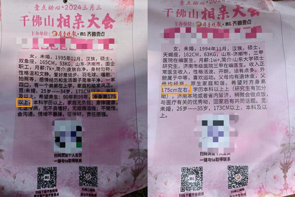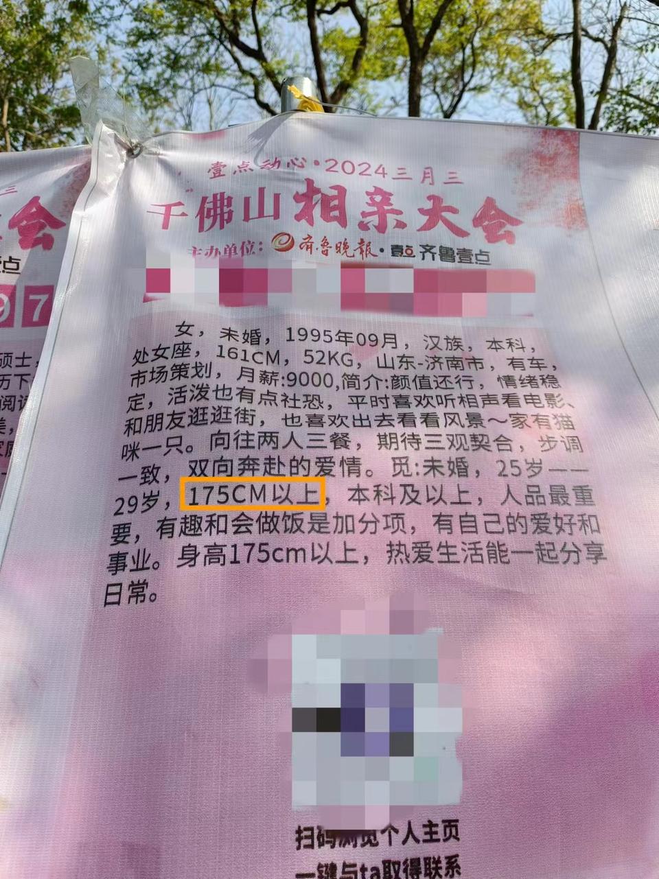 在相亲会现场,写着相亲信息的嘉宾牌成了“红线”,牵起前来寻缘的单身嘉宾。记者在本届千佛山相亲会现场注意到,不少女生相亲都要求另一半身高175+。