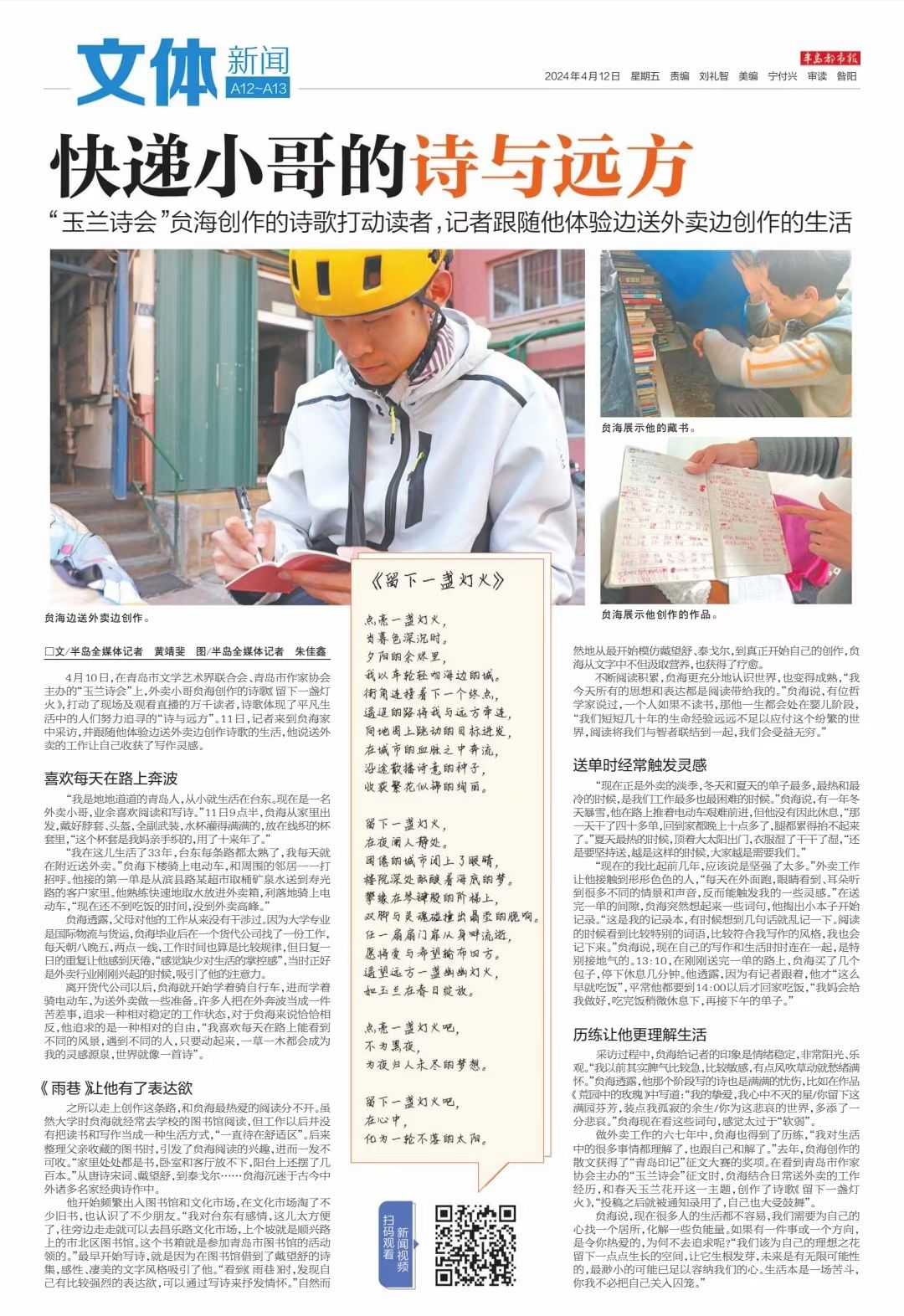 4月10日,在青岛市文学艺术界联合会、青岛市作家协会主办的“玉兰诗会”上,外卖小哥贠海创作的诗歌《留下一盏灯火》,打动了现场及观看直播的万千读者,诗歌体现了平凡生活中的人们努力追寻的“诗与远方”。11日,记者来到贠海家中采访,并跟随他体验边送外卖边创作诗歌的生活,他说送外卖的工作让自己收获了写作灵感。