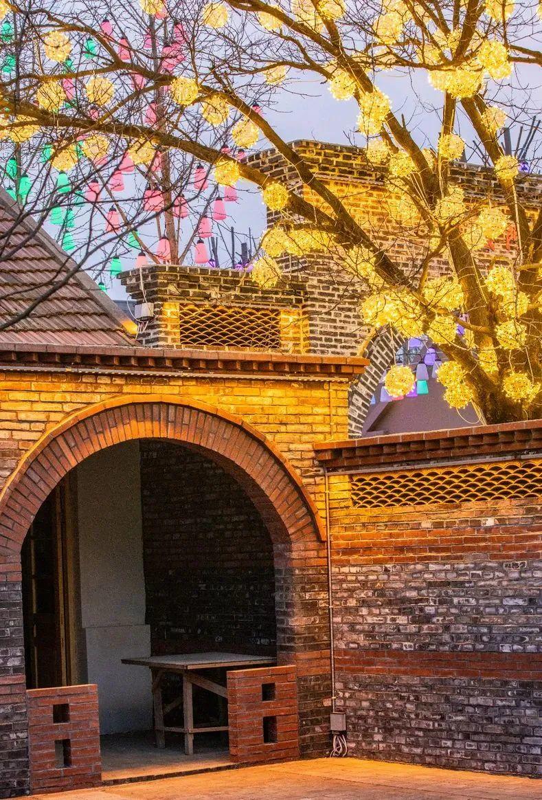 夜幕降临,点缀于枝头的灯串轻轻摇曳,光影与古砖墙相互映衬,犹如一场时光与光影的交响曲。