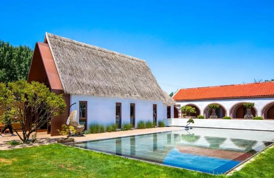白日里,蔚蓝的天空下,清凉的泳池水面倒映着茅草屋顶的轮廓,植物的绿意与红砖的暖色调交织出一幅生动的画卷。你可以漫步于砖红色的回廊,感受清风拂过脸庞,或于温暖的黄昏下,于美宿的宁静庭院体会那份难得的闲适与安宁。