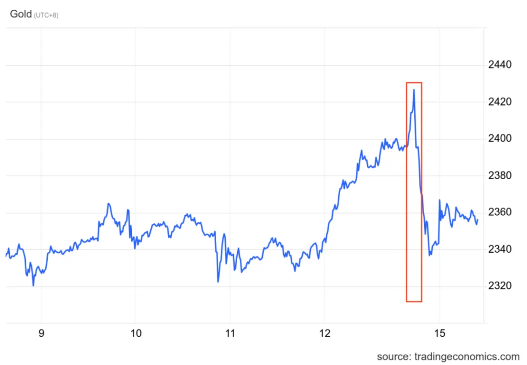 然而就在上周末休市期间,中东地区突然发生进一步刺激地缘政治风险的事件。据媒体报道,当地时间14日,伊朗对以色列发动报复袭击。事件发生后,4月15日,亚洲交易时段开盘,黄金市场出现大涨行情。现货黄金大幅跳空高开约12美元,随后金价一度飙升至2372.71美元/盎司,日内暴涨近30美元。