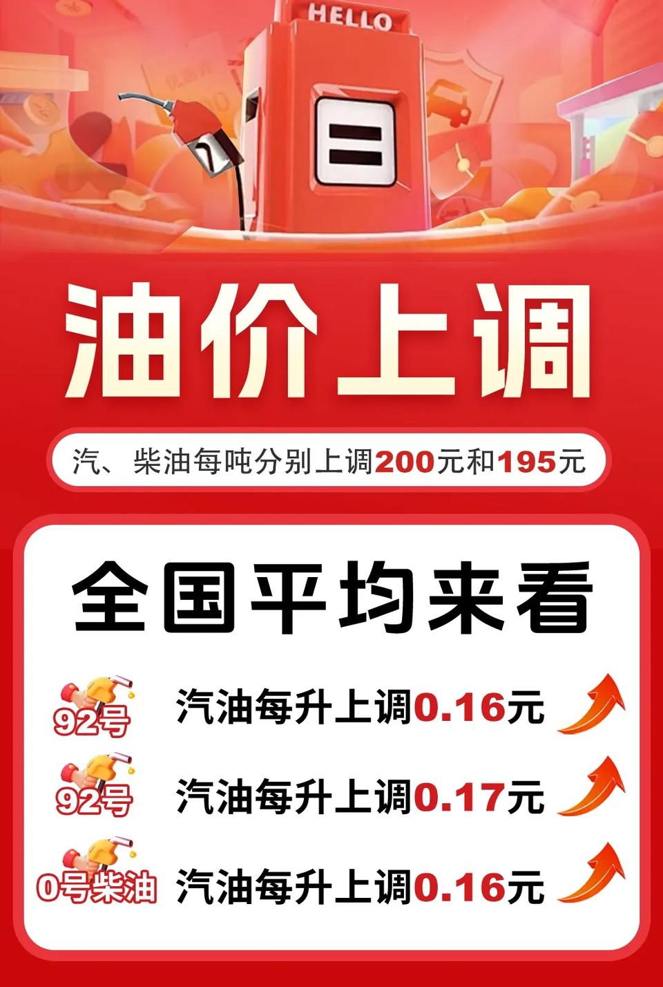 据发改委通知:自2024年4月16日24时起,国内汽、柴油价格每吨分别提高200元、195元。折算为0.16-0.17元/升,加满一箱50升将多花8-9元。