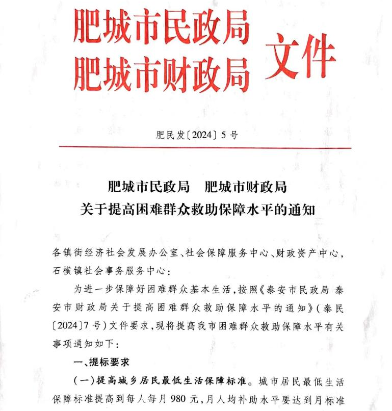 为深入贯彻落实上级通知精神,进一步织牢织密救助兜底保障网,肥城市民政局、肥城市财政局按照泰安市统一部署,联合印发《关于提高困难群众救助保障水平的通知》,再次提高城乡低保、城乡特困、孤儿、事实无人抚养儿童、重点困境儿童、困难残疾人和重度残疾人等困难群众救助标准,切实兜稳兜好困难群众基本生活。