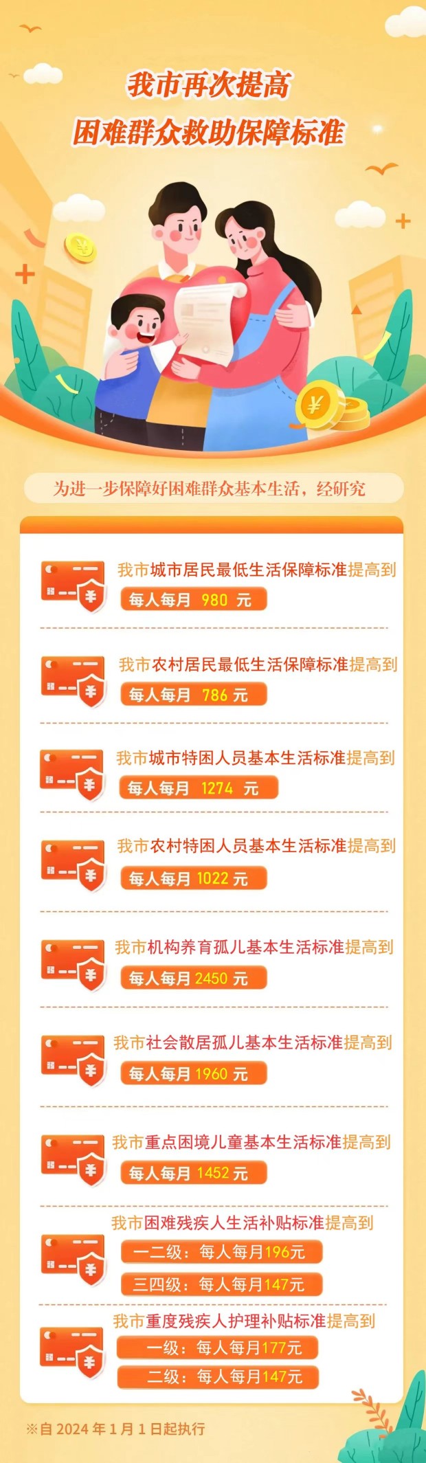 城市居民最低生活保障标准提高到每人每月980元,月人均补助水平要达到月标准的65%以上;农村居民最低生活保障标准提高到每人每月786元,月人均补助水平要达到月标准的60%以上。