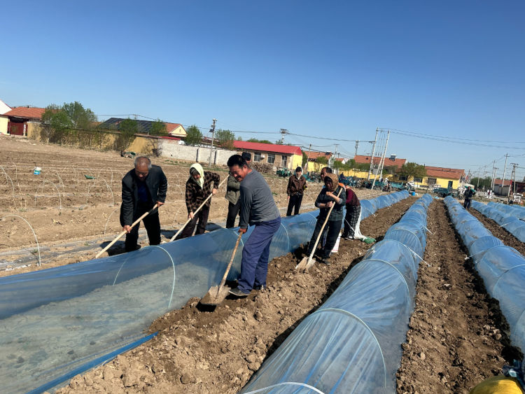 时下,正值西瓜种植的黄金时期,无棣县柳堡镇东岳里村西瓜种植基地里一派繁忙的春耕景象,村民们正忙着栽苗、覆盖小拱棚膜,分工明确,有条不紊地为一棵棵西瓜幼苗“安家落户”,为增收致富打基础。