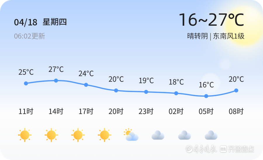 4月18日,农历三月初十,潍坊今天天气晴朗,但午后开始逐渐转阴。预计今天白天最高气温27℃,夜间最低气温16℃。空气质量方面,PM2.5指数为92,属于良好水平,市民可以正常外出活动。东南风1级,吹拂着春天的气息,但也要注意适时增减衣物,以免感冒。