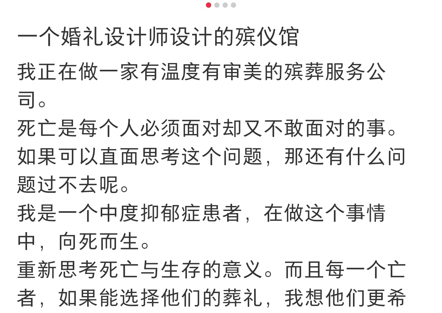 相比勇丰的主动探求,婚礼设计师HAN(化名)则显得有些狼狈。37岁时突然造访的抑郁症才让他不得不开始直视死亡,“抑郁症的人一般都会反复思考死亡的课题。”在叫做“人生送别师”的账号主页,他认真写下了这样一句话:我是一个中度抑郁症患者,在做这个事情中,向死而生。